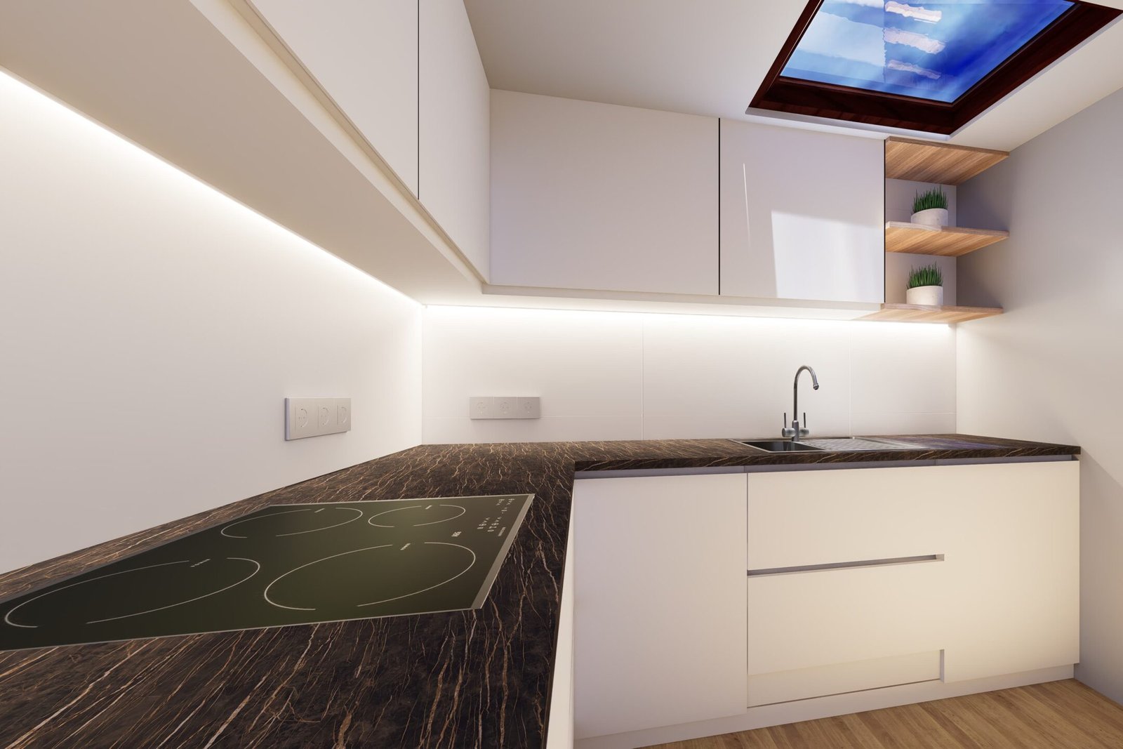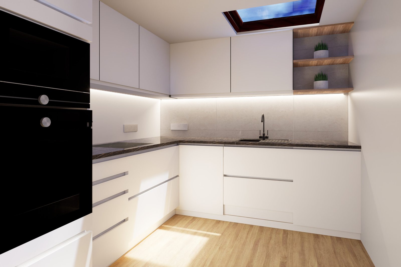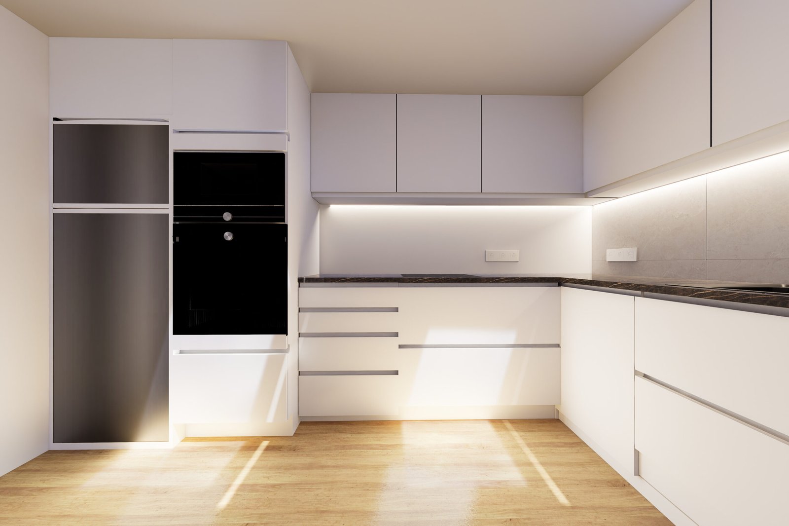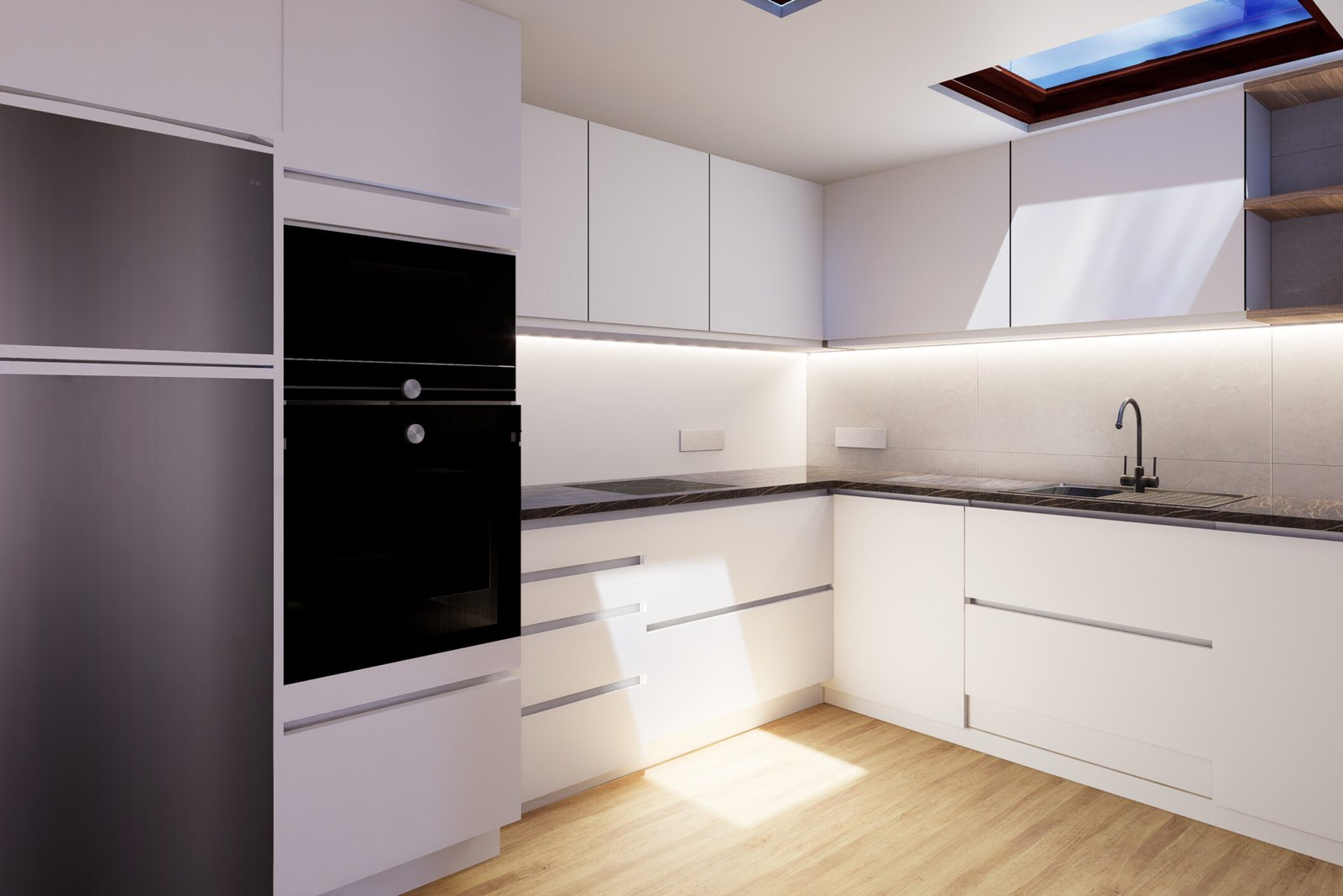 Una cocina diseñada para un joven en Vallecas, donde la funcionalidad y la estética se encuentran en equilibrio. El blanco de los muebles potencia la luminosidad y sensación de amplitud, mientras que las encimeras oscuras aportan contraste y un aire sofisticado. La distribución en “L” optimiza el espacio, ofreciendo comodidad tanto para cocinar como para socializar.