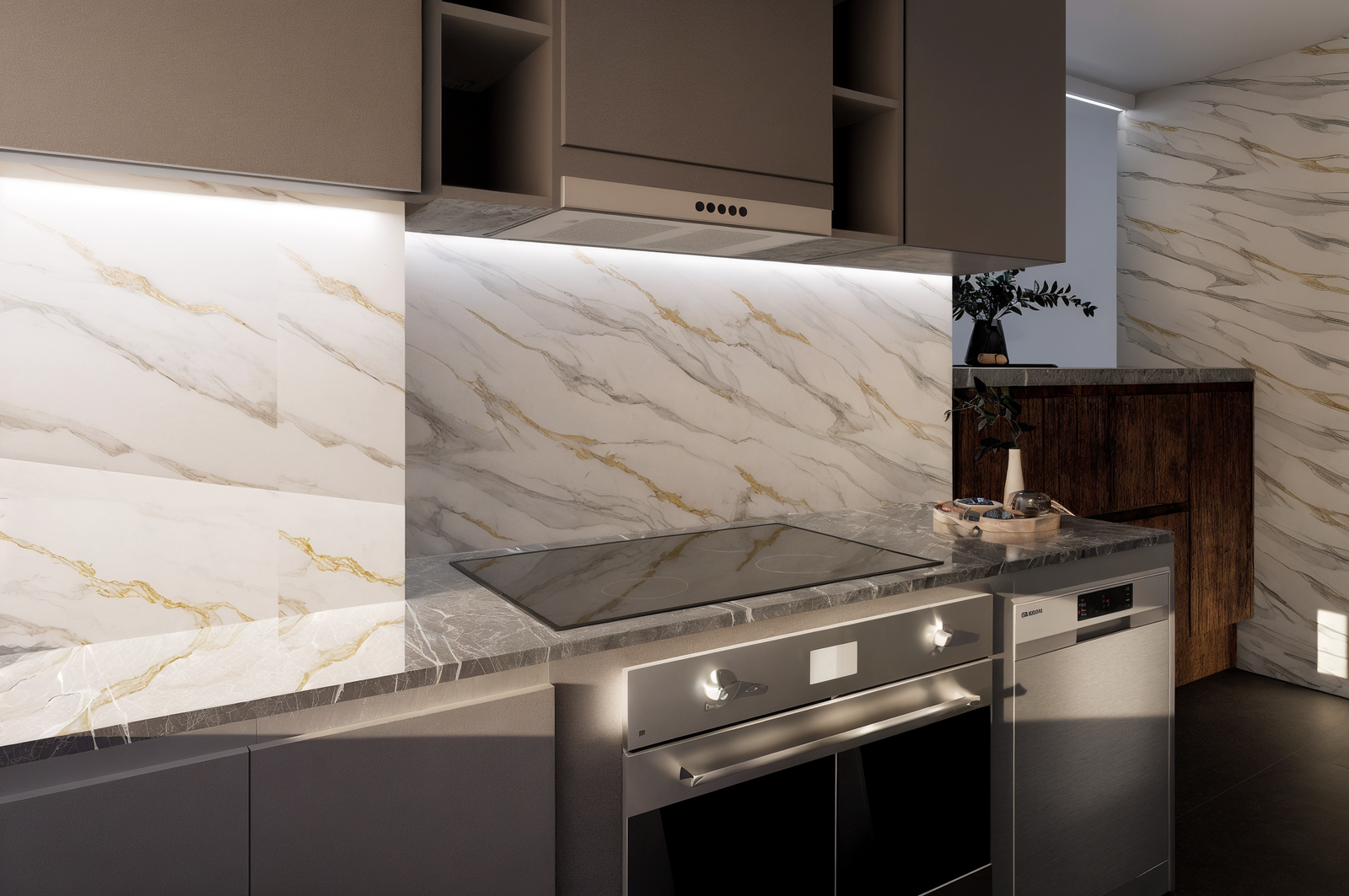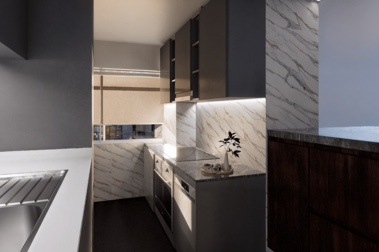Los revestimientos de mármol con vetas doradas aportan un toque de sofisticación, complementando a la perfección los tonos neutros del mobiliario. La iluminación LED bajo los gabinetes superiores realza los acabados y genera una atmósfera cálida y acogedora.
